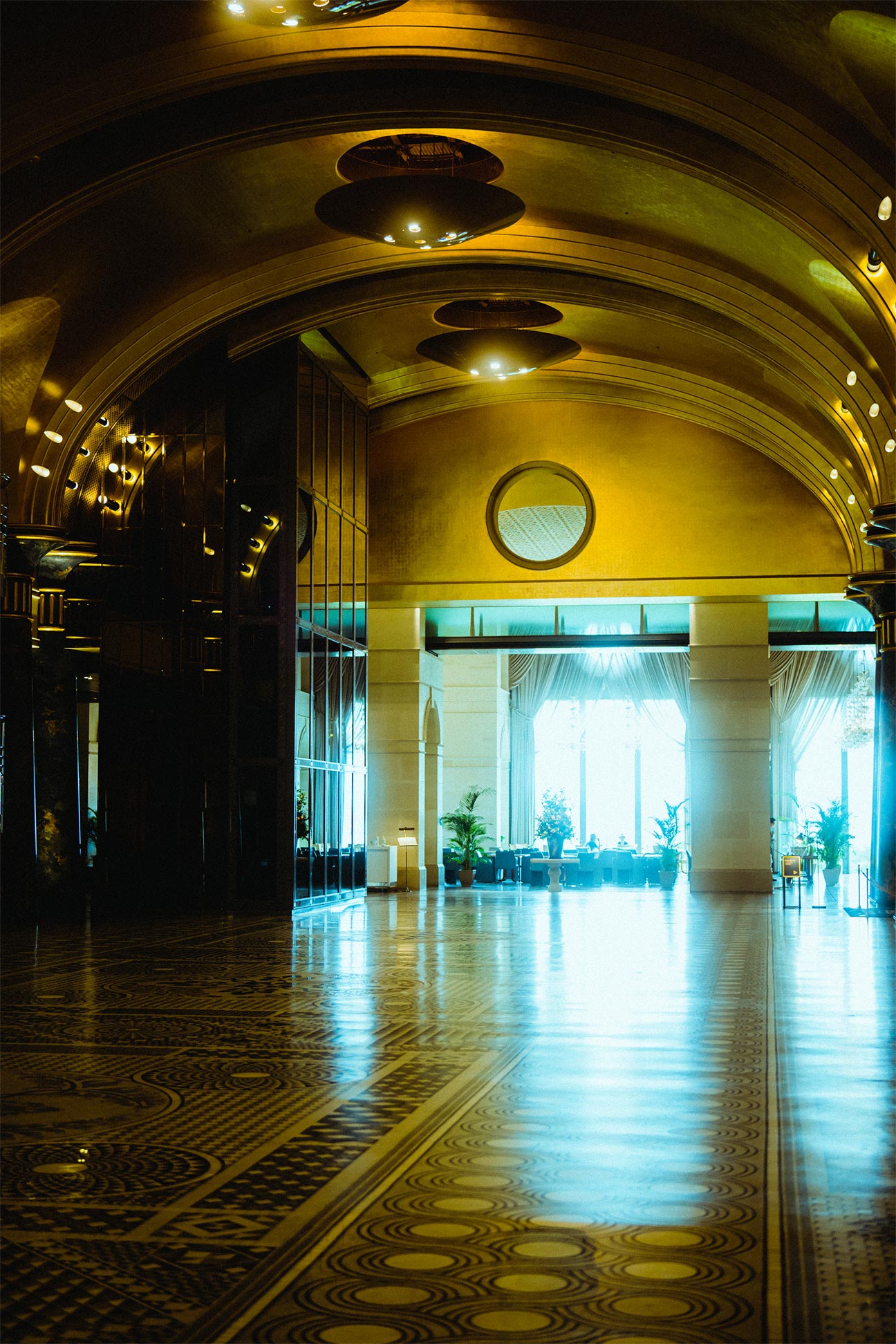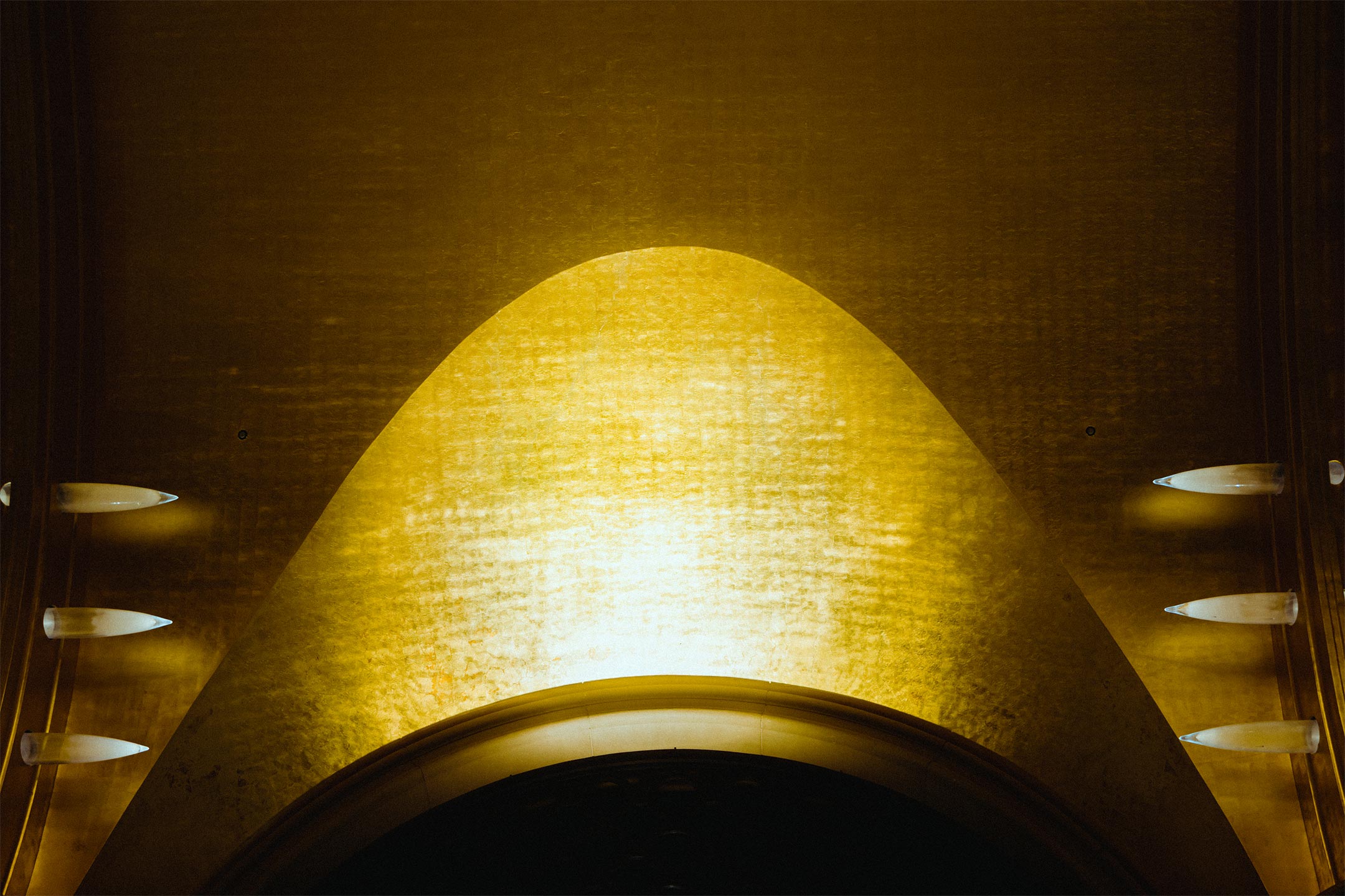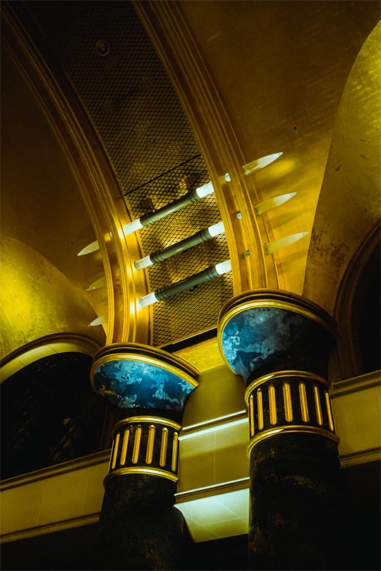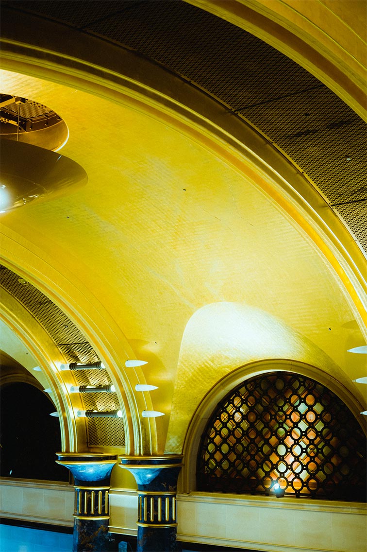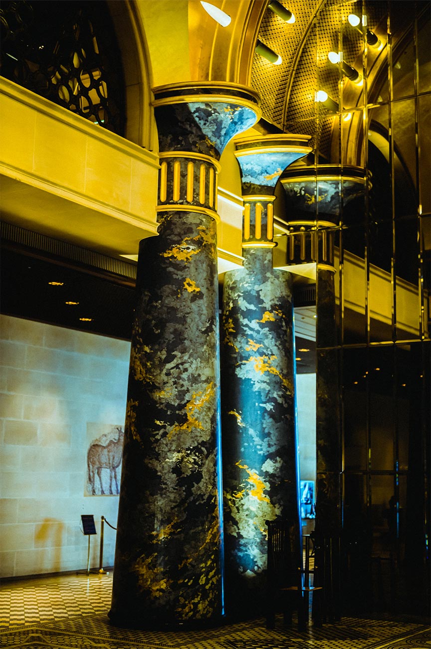 うっとりするような曲線美。宙に浮いたような螺旋階段は建築とアートの融合そのものだ。ゴージャスな空間の中で俯瞰的に見ると、綺麗に収まっているように見える階段も、近づくにつれ独特のデザインや存在感が際立って見える。一度だけでは視界も心にも収まりきらない、職人たちが考え抜き、理想を追い求めた数々の遺産がそこにはある。職人たちはが自らの夢を原動力として、昼、夜と関係なく創作に明け暮れた。柱は石膏マーブルというヨーロッパでは古典の技術を採用。現在はほとんど使われていないこの手法を日本の左官職人の手によって再現した。磨き抜かれた仕上がり、堂々とした柱はメインロビーの壮大なドーム屋根を支える存在に。アートが建築を支え、建築がアートを支えている。この広い、ホテル川久は目に見える全てが芸術的なのだ。そして、夢を夢で終わらせない強靭なこだわりがある。