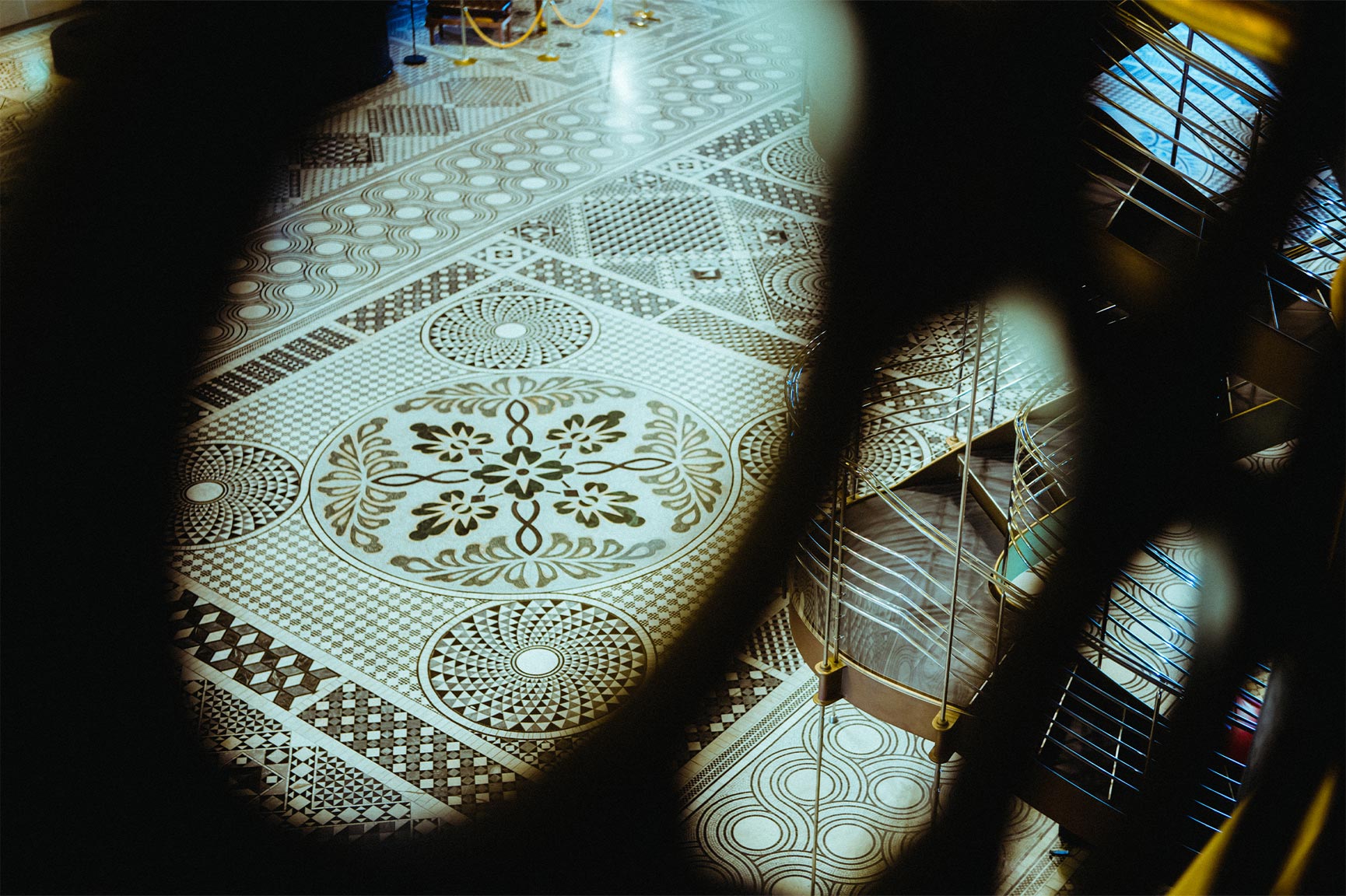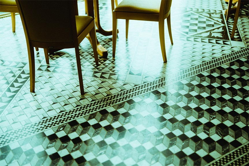 足元には無限の文様世界が広がる。職人たちの手作業によってひとつひとつ埋め込まれた、花や幾何学模様のタイルアート。どこをどう切りとっても絵になる、とても気分が華やぐ足元だ。